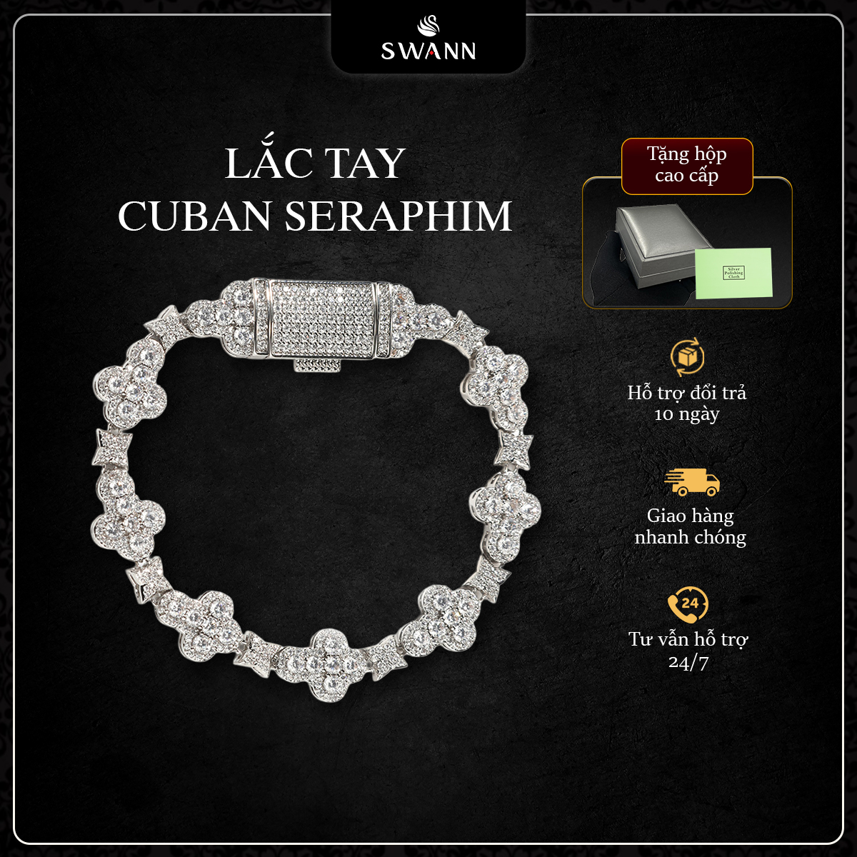 • Thay đá CZ, đá tổng hợp: Swann hỗ trợ thay miễn phí trong suốt thời hạn bảo hành 3 tháng kể từ ngày mua hàng.