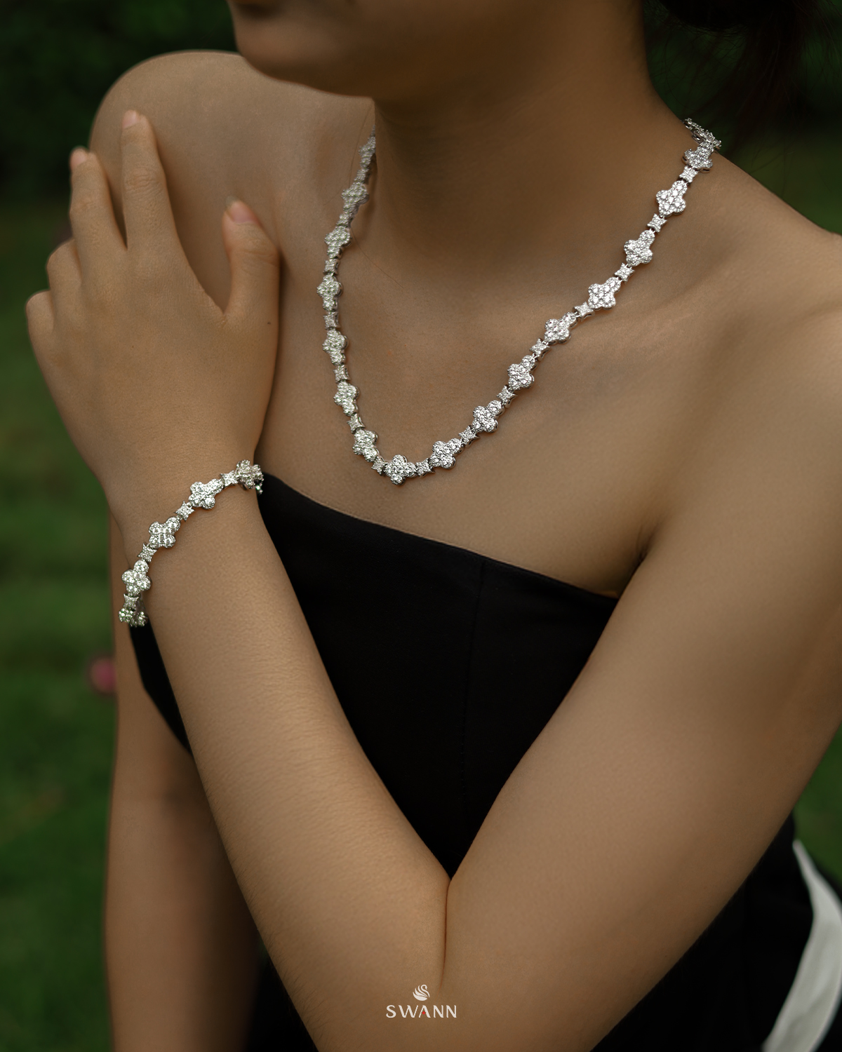 Từng mắt xích được hoàn thiện tỉ mỉ, đính đá sắc nét tạo hiệu ứng lấp lánh mềm, không phô trương mà rất sang.
