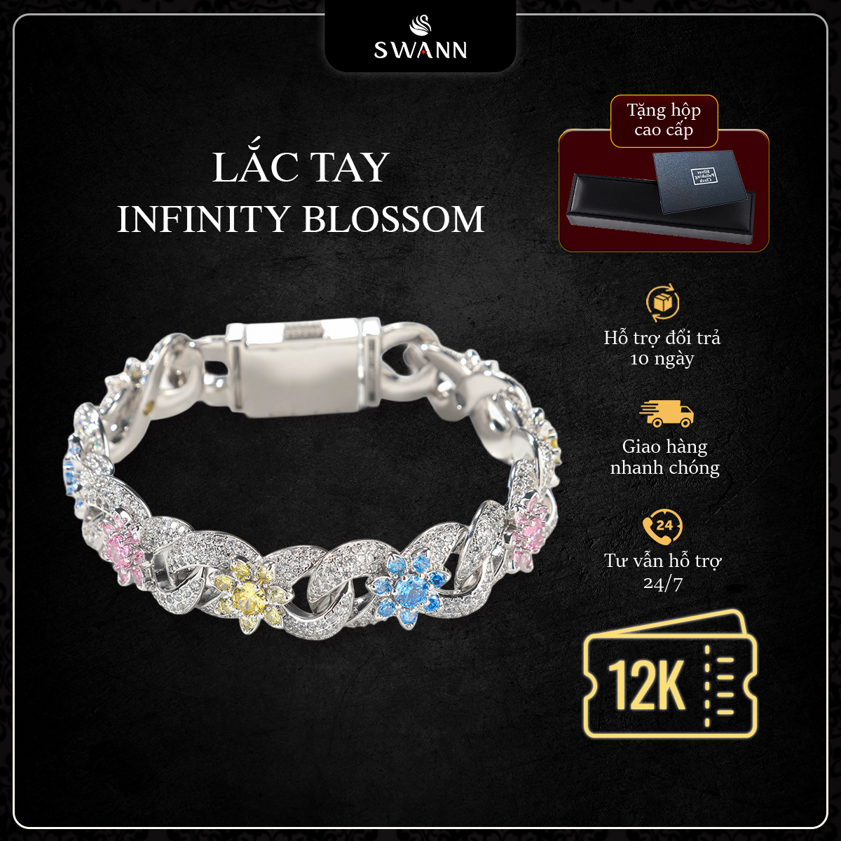 • Thay đá CZ, đá tổng hợp: Swann hỗ trợ thay miễn phí trong suốt thời hạn bảo hành 3 tháng kể từ ngày mua hàng.